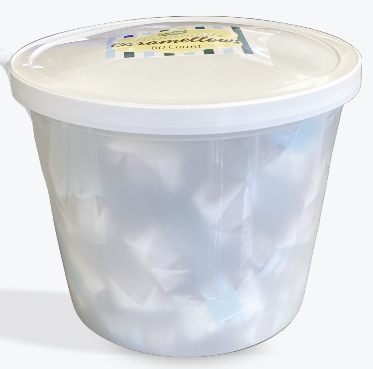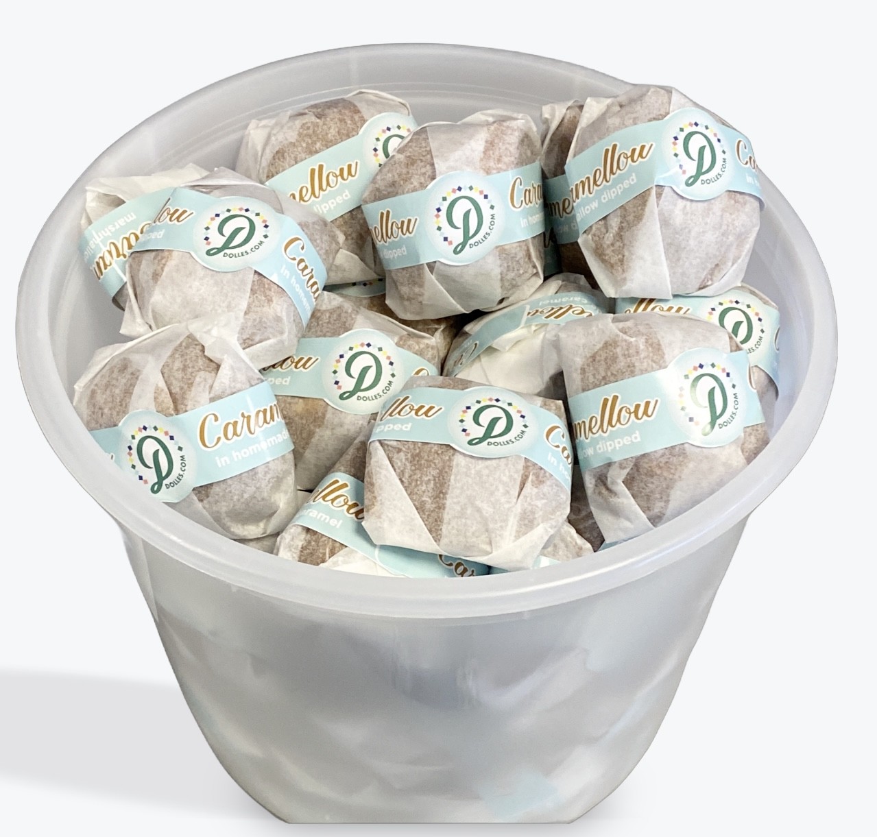 A larger amount of your favorite caramellows now in a bucket. Individually wrapped and ready for your get together.