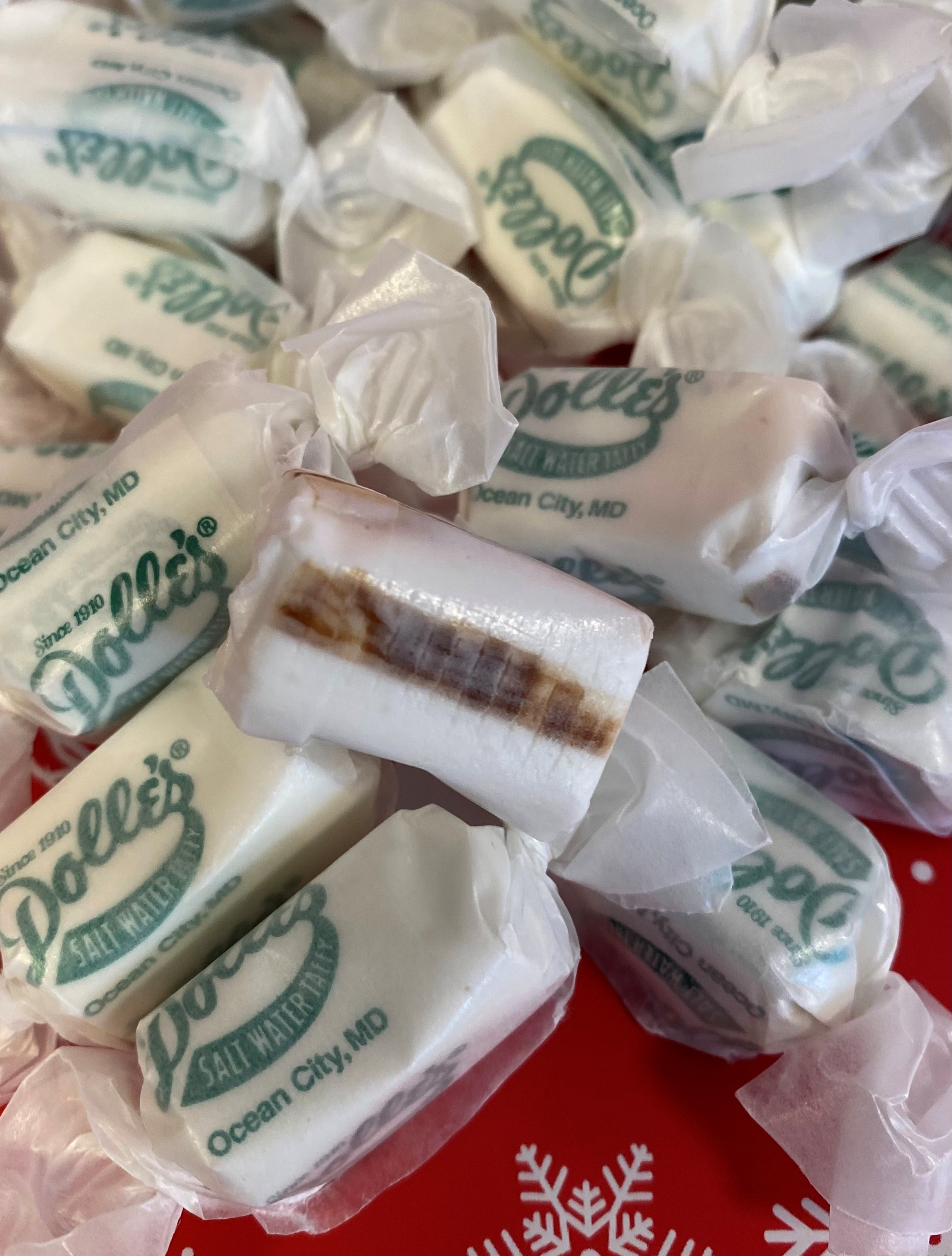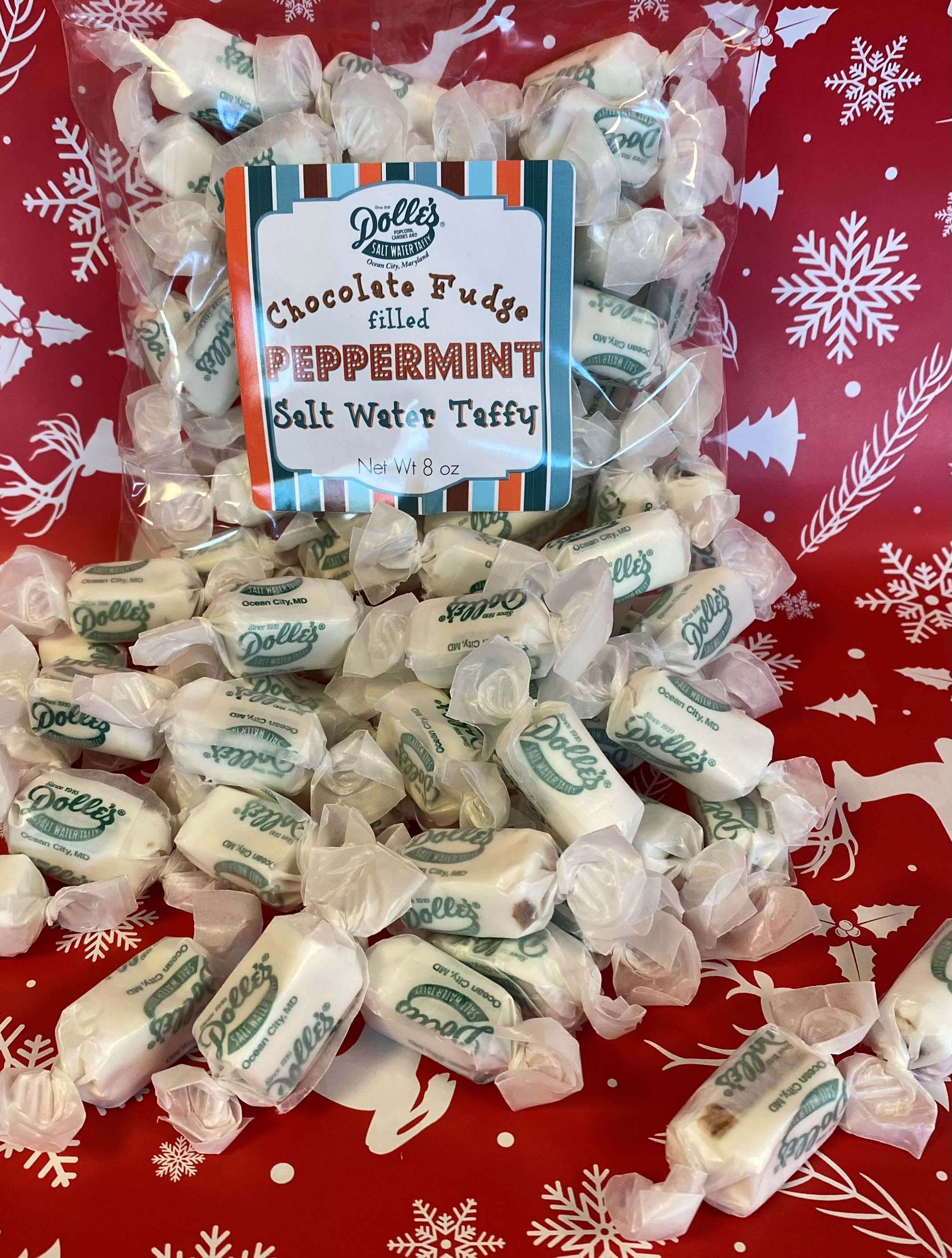 Unwrap the sweet taste of the season! Our homemade boardwalk salt water taffy is elevated to Holiday perfection with this irresistible, limited time flavor. Each piece of classic, chewy peppermint taffy is meticulously stretched and filled with a decadent core of rich, smooth chocolate fudge. Experience the perfect marriage of cool mint, deep chocolate and that unmistakable, old-fashioned boardwalk chew.