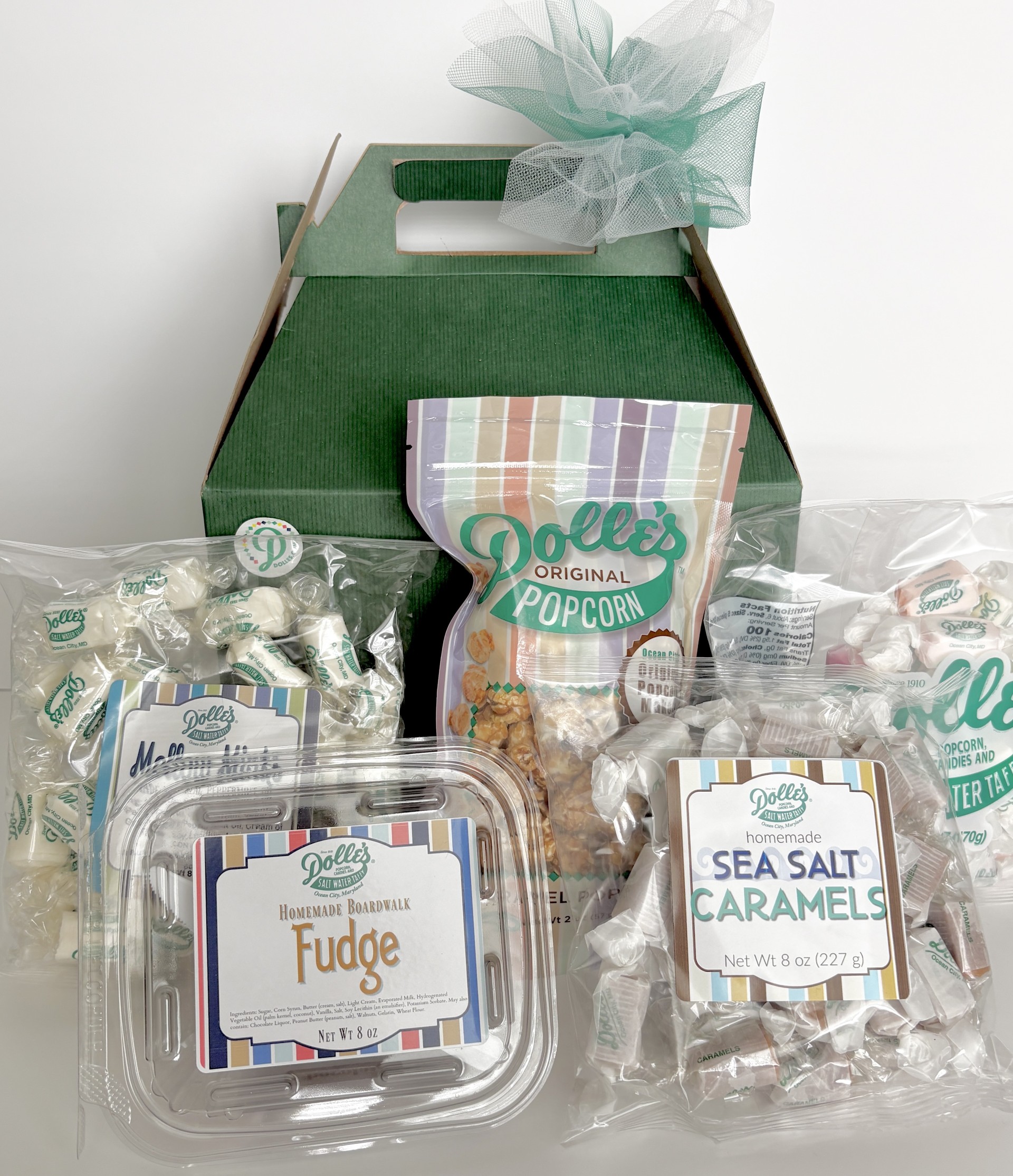 All of these goodies come in a green gable box tied with a ribbon, ready to give to friends and family