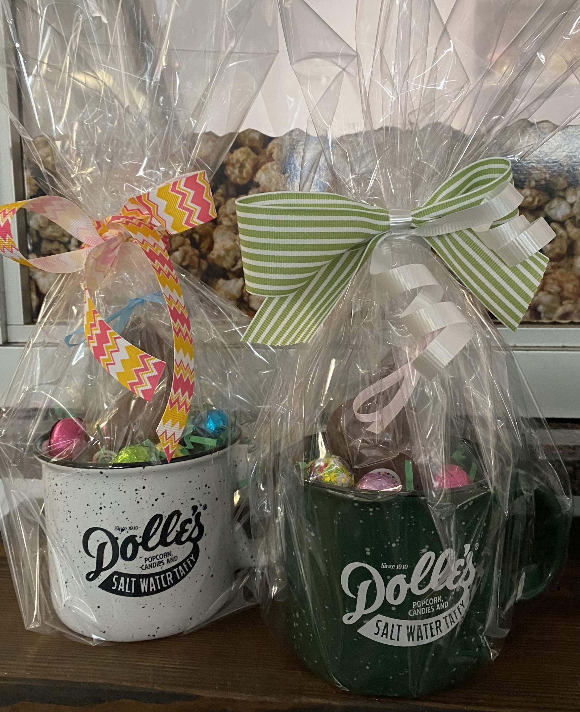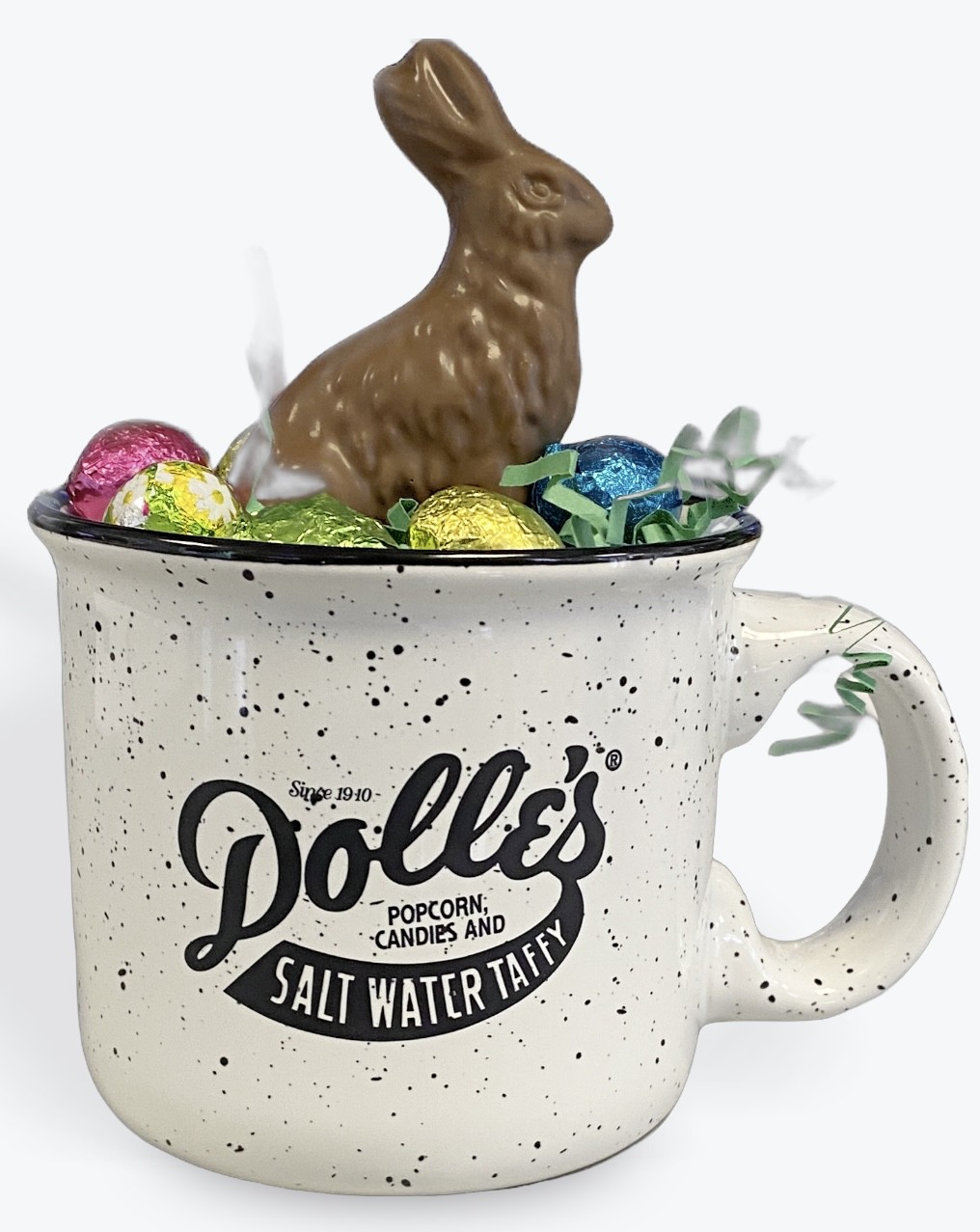 Give a gift that lasts long after the chocolate is gone! Our signature Dolle’s camp mug is the perfect cozy keepsake, but the real magic is what’s inside. We’ve tucked a delicious homemade chocolate bunny and a nest of foiled milk chocolate eggs inside this stylish mug.