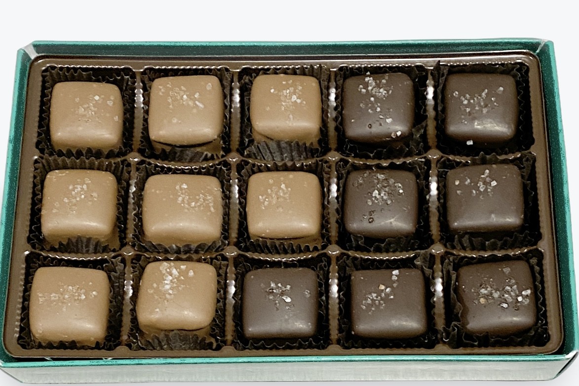 • Vanilla caramels enrobed in rich chocolate and sprinkled with coarse sea salt
